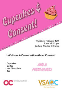 Join us for Cupcakes & Consent on Thursday, February 12th from 9 AM to 12 PM in the Lecture Theatre entrance. Let’s have a conversation about consent! We will provide complimentary cupcakes, coffee, hot chocolate and tea. There will also be an opportunity to give the Prize Wheel a spin!