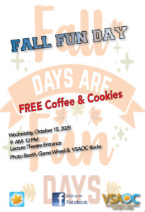 Feeling a little stressed about classes and assignments? You are not going to want to miss this! One day only! A Fall Fun Day is being hosted by the VSAOC Wednesday, October 15th from 9:00 AM – 12:00 PM in the Lecture Theatre Entrance. Stop by and enjoy a complimentary coffee, tea or cookie! A photo booth, a Games Wheel and prizes will also be available for students. Join us in the Lecture Theatre Entrance!