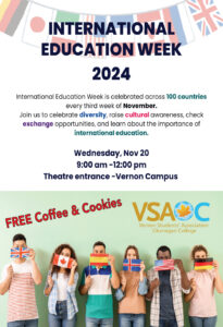 International Education Week is celebrated across 100 countries every third week of November. Join us to celebrate diversity, raise cultural awareness, check exchange opportunities, and learn about the importance of international education. We will be providing all attendees with COMPLIMENTARY coffee, hot chocolate, tea and cookies.