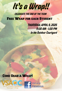 Come celebrate the end of the term. We are giving a free wrap to each student who comes to the Outdoor Courtyard on Thursday, April 9, 2026 from 11:30 AM – 1:30 PM. Come grab a wrap and celebrate the end of the term!