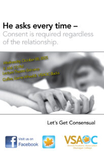 Come give the WHEEL a spin, answer a question regarding sexual consent and receive some FREE swag! Oh and you are not going to want to miss this! FREE Coffee, hot chocolate, tea and cookies in the Lecture Theatre entrance Wednesday, October 8, 2025 from 9 AM – 12 PM. Come learn about the health and wellness services that are available to students on this campus. Also, we are giving away FREE swag related to our Let’s Get Consensual Campaign. #let’sgetconsensual, #notanymore, #webelieveyou, #preventsexualviolence, #VSAOC
