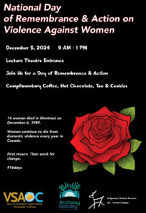 We would like to invite everyone to a day of Remembrance and Action on Violence Against Women. The VSAOC, the OC Indigenous Student Services and community members are hosting an event to honour of the fourteen (14) women slain December 6, 1989 at L’Ecole Polytechnique and the women killed or missing on the Highway of Tears. We will be providing complimentary coffee, hot chocolate, tea and cookies in the Lecture Theatre Entrance and the Kal View Cafe. We are hosting the event on Thursday, December 5, 2024.