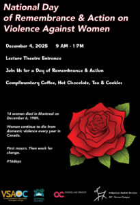 We would like to invite everyone to a day of Remembrance and Action on Violence Against Women. The VSAOC, the OC Indigenous Student Services and community members are hosting an event to honour of the fourteen (14) women slain December 6, 1989 at L’Ecole Polytechnique and the women killed or missing on the Highway of Tears. We will be providing complimentary coffee, hot chocolate, tea and cookies in the Lecture Theatre Entrance. We are hosting the event on Thursday, December 4, 2025.