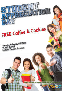 Feeling a little stressed about classes and assignments? You are not going to want to miss this! One day only! Student Appreciation Day Celebration is being hosted by the VSAOC Tuesday, February 3rd from 9:00 AM – 12:00 PM in the Lecture Theatre Entrance. Stop by and enjoy a complimentary coffee, hot chocolate, tea and cookie!